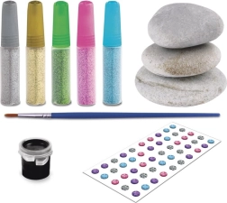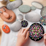 Sadržaj pakiranja osmišljen je tako da odgovara početnicima i malim umjetnicima. Glatki kamenčići dobro leže u ruci, kist omogućuje precizan rad, a metalna paleta (plava, ružičasta, zelena, srebrna i zlatna) daje svakom motivu profinjen izgled. Kreativnosti nema granica – od mandala preko nasmijanih lica do vlastitih ornamenata.