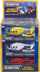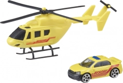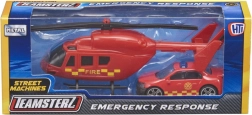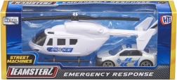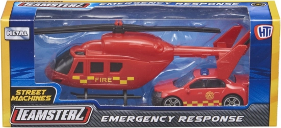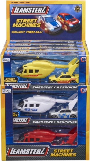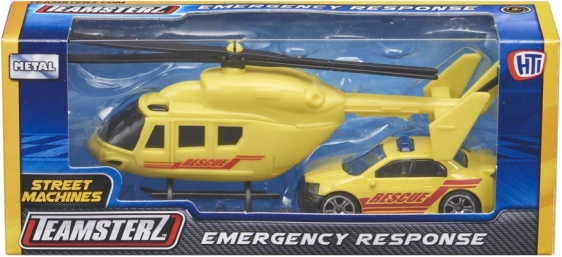 Set TEAMSTERZ spaja zabavu i izdržljivost: detaljno izrađen helikopter s ručno okretanim lopaticama i akcijski interventni auto sa slobodno okretnih kotačima. Zahvaljujući metalnoj (tlakovano lijevanoj) konstrukciji i kvalitetnim plastičnim dijelovima djeca uživaju u realističnojoj igri na policiju, vatrogasce i spasioce.