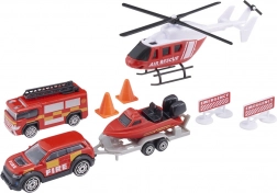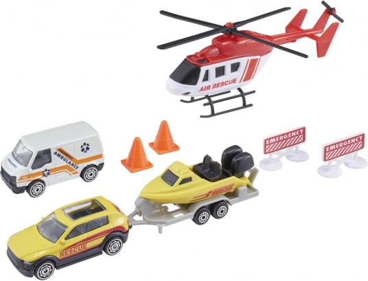 - Sadržaj pakiranja: helikopter, interventno vozilo, 4x4 s vučnim uređajem, čamac ili jet ski s odvojivom prikolicom, prometni čunjevi i znakovi za hitne situacije.