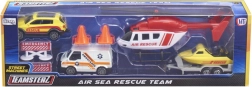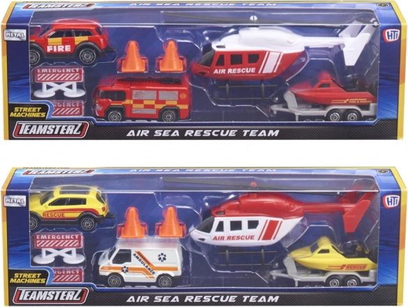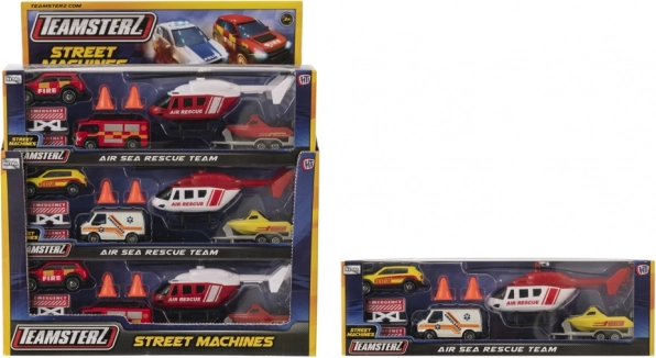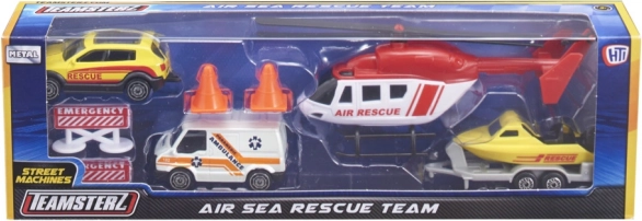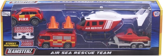 Set Teamsterz Spasilački tim air & sea pretvara dječju sobu u akcijsku zonu punu hrabrih misija. Visoko detaljna vozila s metalnom karoserijom i plastičnim dodacima podnose intenzivnu igru, a zahvaljujući kotačima slobodnog hoda glatko se kreću po svakoj podlozi. Helikopter s ručno okretanim rotorima svakoj spasilačkoj akciji daje pravi, realističan efekt.