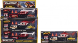 Pripremite se za vlastite spasilačke misije na kopnu i na vodi uz set Teamsterz! U njemu ćete pronaći liveni helikopter s ručno okretanim rotorima, interventno vozilo, 4x4 s kukom za vuču, čamac s prikolicom i hitne dodatke. Kvalitetna tlačno livena karoserija i kotači slobodnog hoda jamče sate maštovite zabave za djecu od 3 godine.