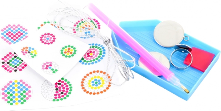 Set sadrži 8 boja kamenčića, bazu za privjesak i prsten, uzicu, 9 šablona za privjeske, 4 šablone za prstenje, podlogu i aplikacijsku olovku – samo otvorite i stvarajte.