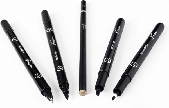 Dio seta su dva dvostruka flomastera s kombinacijom brush tipa i fine tipa 1 mm za varijabilne poteze, grafitna olovka 3H za skice i osnovu, okrugli marker 1 mm za ujednačene linije i kaligrafski marker 3 mm za izražajne serifne poteze. Set je idealan za bullet journal, pozivnice, kartice, ilustracije i tehnički nacrt.
