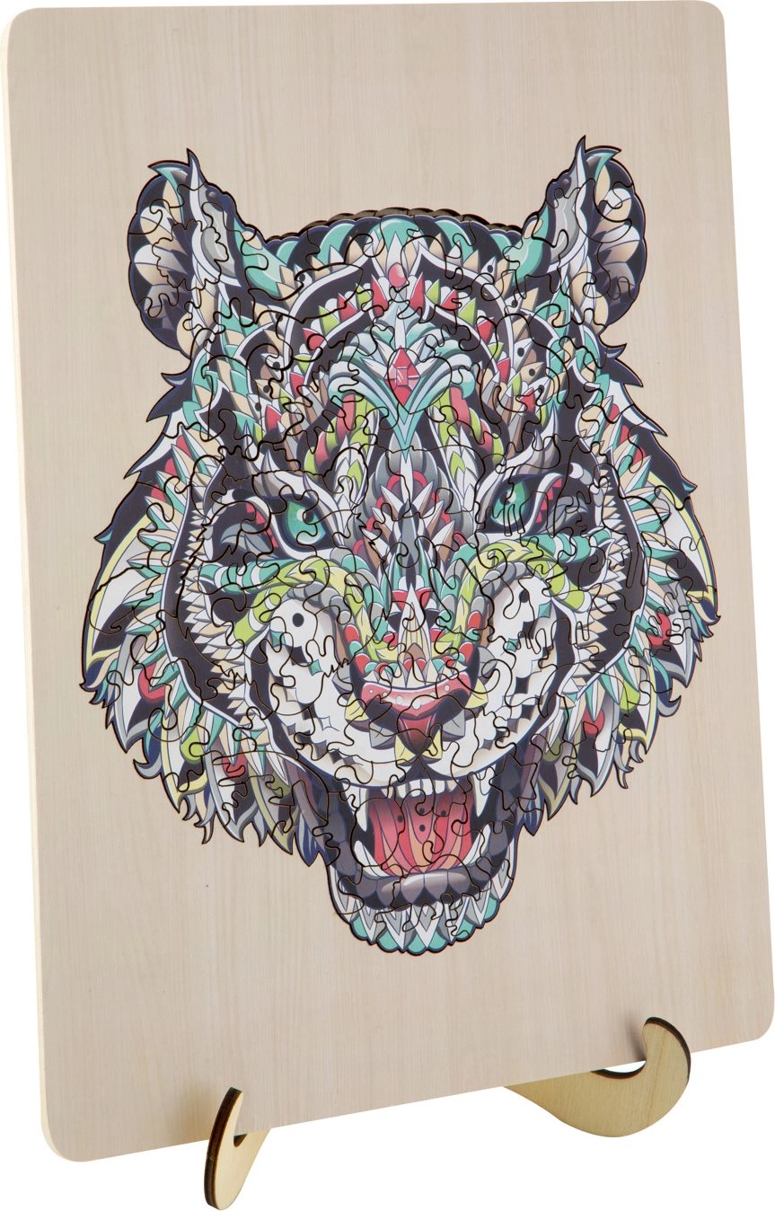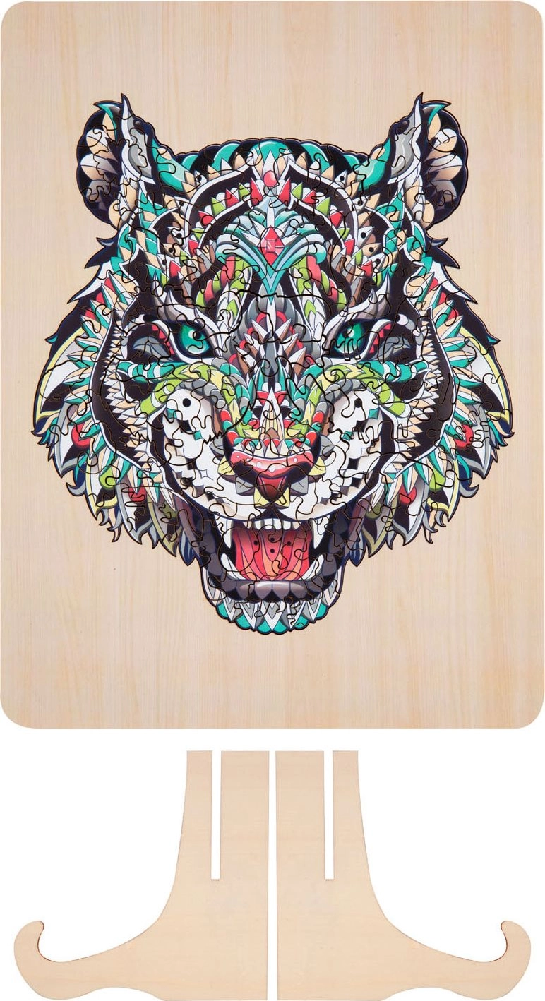 Drvene puzzle Tigar 135 dijelova – pakiranje sadrži stalku na kojoj možeš izložiti svoje puzzle. Veličina slike 30×22,5 cm.