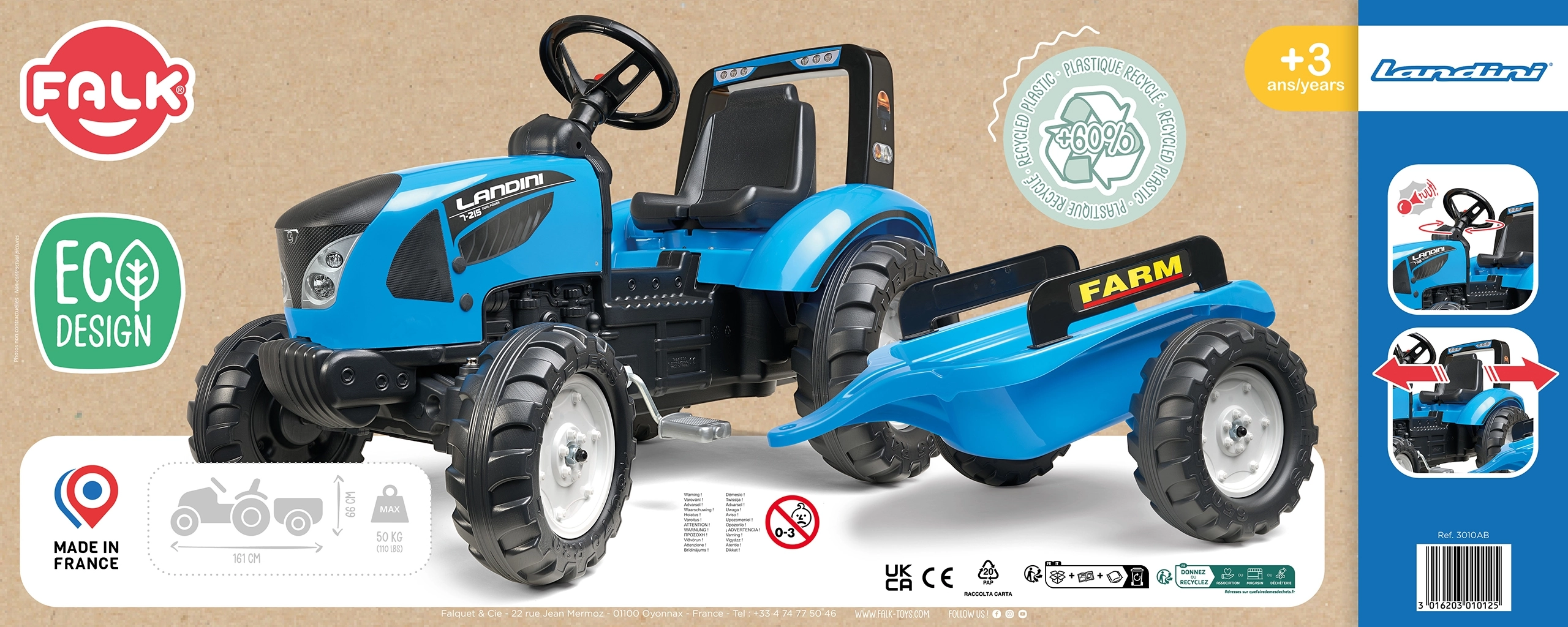 Pedalni traktor LANDINI pažljivo je izrađena igračka od visokokvalitetne plastike, koja podnosi svakodnevne dječje avanture u vrtu i na igralištu. Realistični detalji, poput prednjih svjetala, robusnih kotača i prikolice s natpisom “FARM”, naglašavaju autentičan izgled pravog traktora.