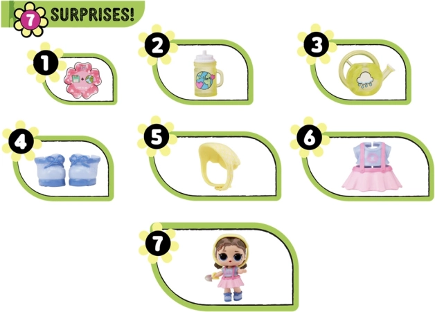 Lutkica dolazi sa 7 iznenađenja, uključujući kolekcionarske dodatke kao boca, kantica, i još mnogo toga.
