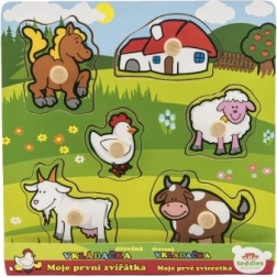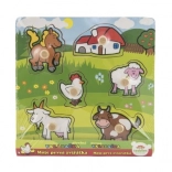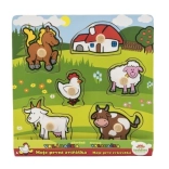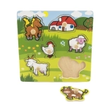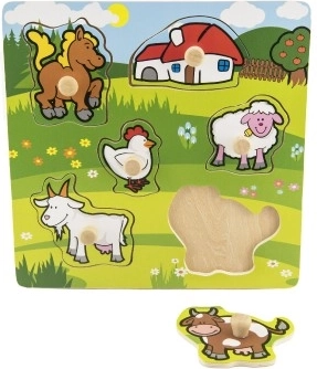 Ova umetnička sadrži ukupno 5 obojenih životinja uključujući konja, kozu, ovcu, kokoš i kravu, koje se lako mogu uhvatiti zahvaljujući malim drvenim ručkama. Svaki dio ima svoje mjesto na drvenoj podlozi, što također pomaže djeci da nauče ispravno postaviti svaki dio.