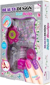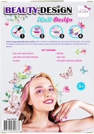 Set Beauty-Design “Noktni studio”. Sadržaj: 1× kist, 1× rašpica za nokte, 1× naljepnice za nokte, 1× peel-off lak, 1× kutijica sa šljokicama, 1× žličica. Za djecu od 3 godine i više