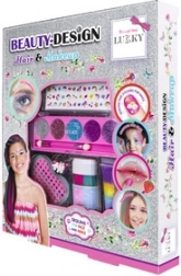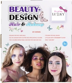 Otkrijte svijet ljepote s razigranim setom Lukky Beauty Design Kosa & make-up, osmišljenim posebno za djecu. U pakiranju ćete pronaći sve za jednostavno i sigurno uljepšavanje: svjetlucava kremasta sjenila s aplikatorom, jagodasti sjaj za usne, šarenu krijonu za kosu, naljepnice za nokte i sjajne “draguljaste” naljepnice za lice. Ne nedostaje ni slatki prsten s motivom jednoroga.