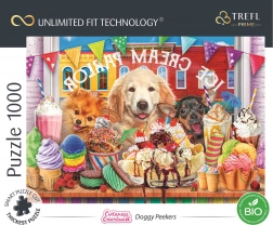 Trefl Unlimited Fit Technology (UFT) donosi novu dimenziju slaganja: pojedine motive iz serije moguće je slobodno povezivati i stvarati velike puzzle kolaže bez ograničenja. Motiv slatkih psića ispred slastičarnice oduševit će ljubitelje životinja i kvalitetnog dizajna.