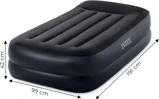 Ovaj jednokrevetni napuhavajući madrac INTEX nudi udobnost klasičnog kreveta zahvaljujući naprednim tehnologijama Fiber‑Tech i Dura‑Beam. Čvrsta unutarnja konstrukcija sprječava ljuljanje i propadanje, povećana visina 42 cm olakšava ustajanje i povećava udobnost. Velur, nježno rebrasta površina mekana je na dodir i pomaže da plahta ostane na mjestu.