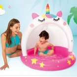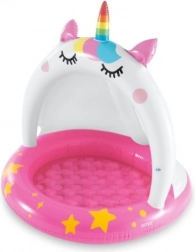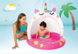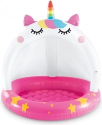 Preslatki dječji bazen INTEX u obliku jednoroga s nadstrešnicom donosi puno sigurne zabave za djecu od 1 do 3 godine. Sjenilna nadstrešnica štiti od sunca, mekana napuhavajuća podloga povećava udobnost, a izdržljiv vinil 0,25 mm osigurava dug vijek trajanja. Kompaktne dimenzije 102×102 cm i zapremnina 45 l idealne su za prve vodene igre u vrtu.