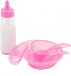Ovaj set za lutke idealan je dodatak za svaku malu čuvalicu. Pripremi ukusne obroke u zdjelici i posluži ih svojoj lutki pomoću priložene žlice i vilice. Promatraj kako se mlijeko u bočici 'ispari' kada nahraniš lutku, a ponovno se pojavi kada bočicu okreneš. Ovaj set donosi sate zabave i potiče razvoj fine motorike i brigu o drugima.