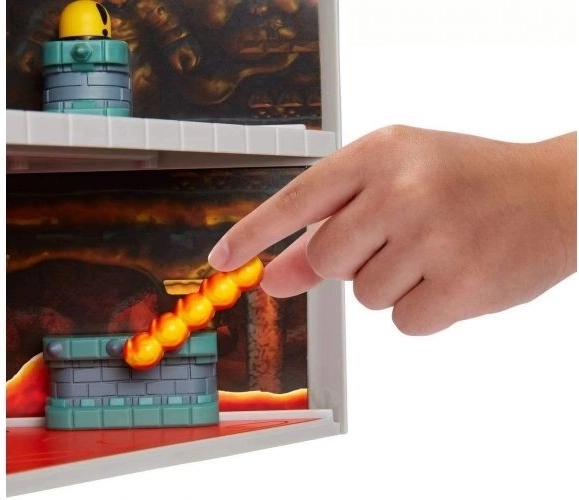 Ovaj detaljno izrađen igrački set prenosi kultnu razinu iz igara SUPER MARIO izravno u dječju sobu. Očekuju vas pomične platforme, lift, rotirajuće vatrene kugle i dramatična preklopna vrata koja šalju Bowsera u „lavu”. Realistični zvučni efekti pojačavaju svaki trenutak igre.