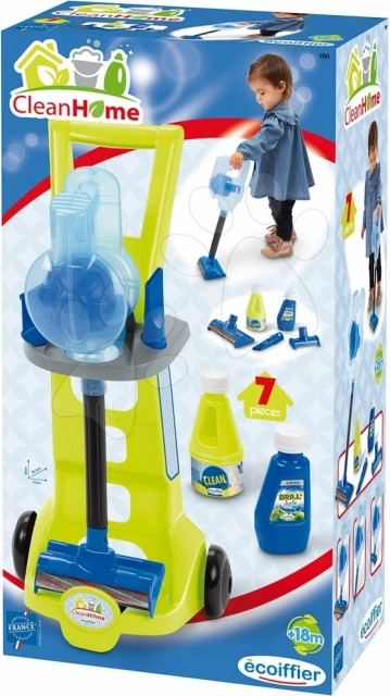 Ova kolica za čišćenje iz linije Ecoiffier opremljena su štapnim usisavačem s tri različita nastavka, dvama sredstvima za čišćenje i kolicima s dva kotača, koja olakšavaju premještanje cijelog seta na bilo koje mjesto.