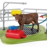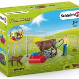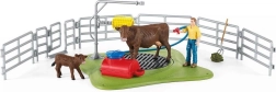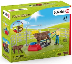 Set sadrži sve potrebno: figurice krave, tela i farmera, zatim pribor kao što su crijevo, pumpa s funkcijom špricanja, četka za krave, vrbove ograde i vrata. Kvalitetni, ručno oslikani detalji tipični za SCHLEICH potiču maštu i podržavaju igranje uloga s poljoprivrednom tematikom.