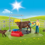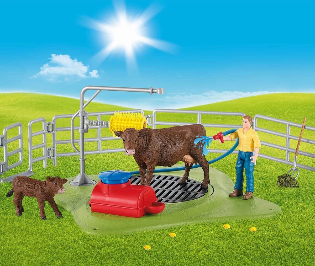 Kutak za pranje stoke iz serije SCHLEICH Farm World pretvara svakodnevnu brigu o životinjama u sjajno iskustvo. Poljoprivrednik Martin pomoću funkcionalne pumpe zaista šprica vodu, dok tele stoji na rotirajućem tanjuru kako bi se moglo oprati sa svih strana. Nakon tuša slijedi masaža četkom koja krave lijepo očisti i razveseli male uzgajivače.