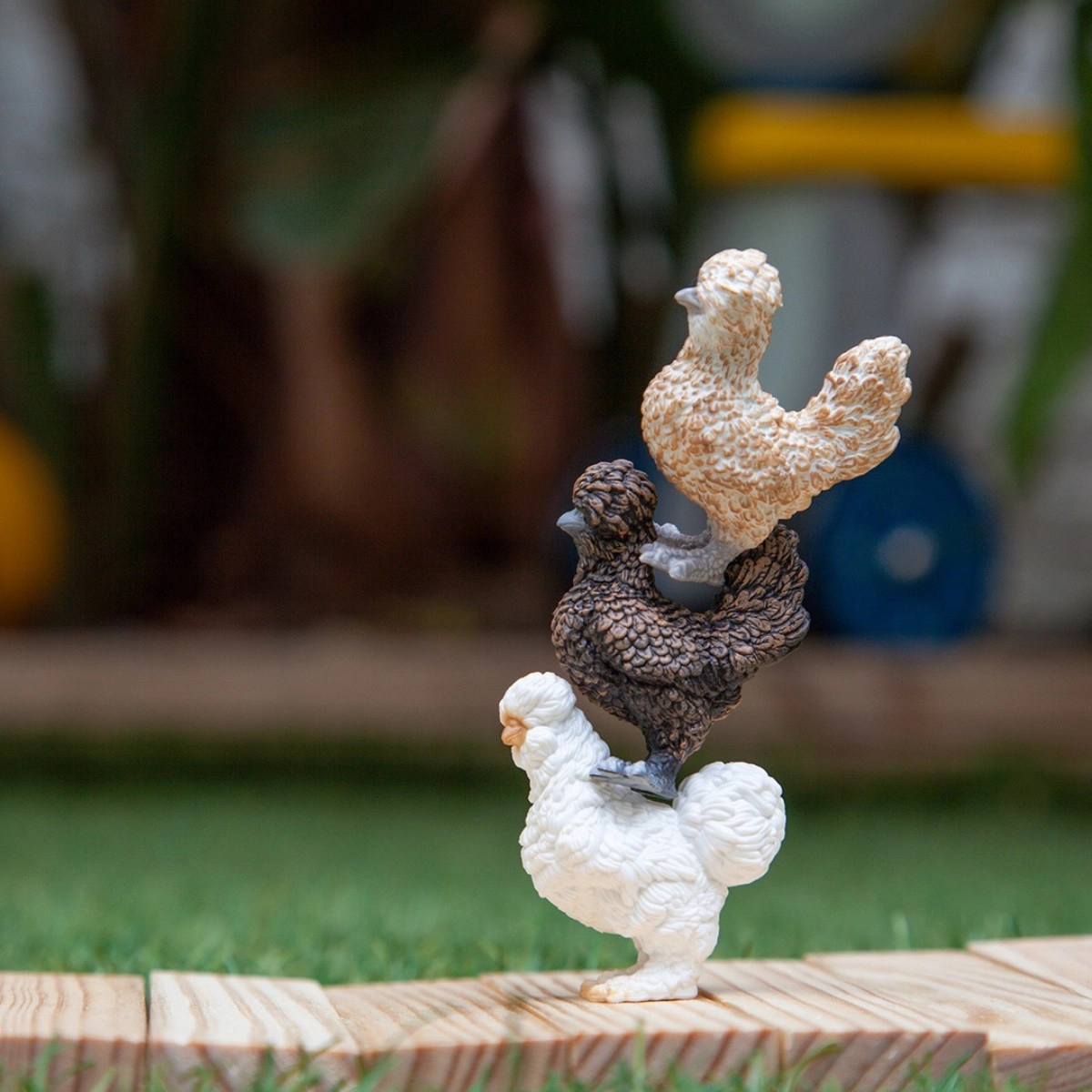 Djeca će cijeniti izdržljivu plastiku, stabilan stav i tri različita izvedenja boja zahvaljujući kojima se kokoši lako razlikuju. Set je idealan za samostalnu i skupnu igru, potiče razvoj fine motorike, mašte i pripovijedanja.