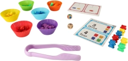 36 medvjedića (6 boja), 6 silikonskih čašica, 2 drvene kocke, 16 dvoslojnih kartica sa zadacima, pinceta