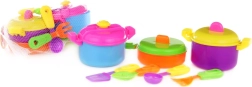 Zabavan dječji set posuđa u praktičnoj mrežici za male kuhare od 3 godine. Sadrži 2 lonca s poklopcima, tavu s poklopcem i 4 komada kuhinjskog pribora, idealno za igru kuhanja i razvoj mašte.
