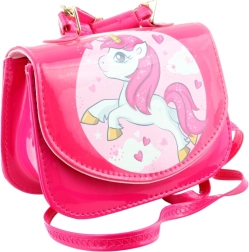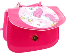 Ova ružičasta torbica s preslatkim jednorogom savršen je dodatak za svakodnevno nošenje i posebne prilike. Sjajna površina, zlatni metalni detalji i razigrani print čine je stilskim komadom koji djeca obožavaju.