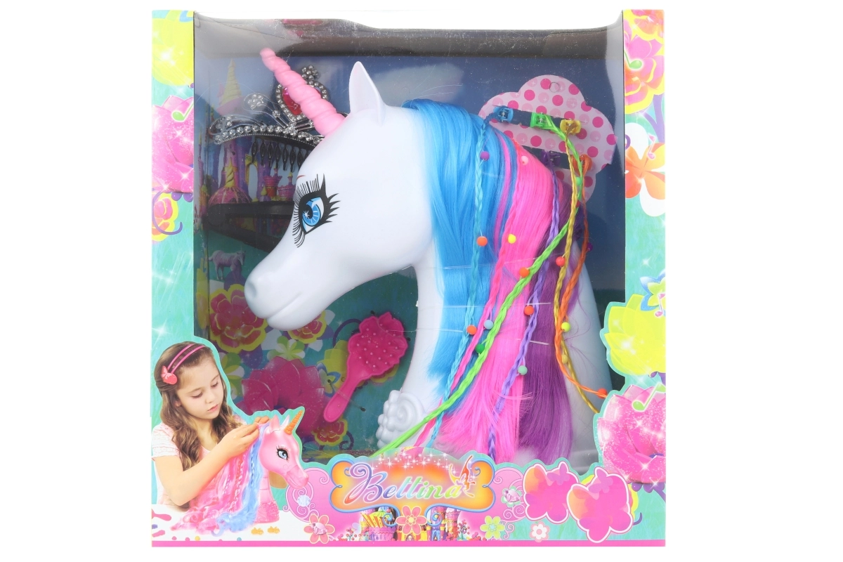 Glava jednoroga za češljanje dimenzija približno 22 x 27 cm. U pakiranju se nalaze češalj, kruna i 6 šarenih pletenica. Dimenzije pakiranja približno 30,5 x 32 x 14 cm. Dob 3+