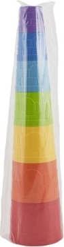 Ova šarena sklopiva piramida donosi djeci puno zabave i učenja u jednom. Sedam plastičnih čašica različitih veličina lako se slaže u visoku kulu ili umeće jedna u drugu – to trenira logiku, strpljenje i finu motoriku.