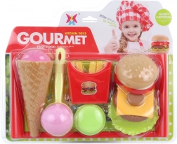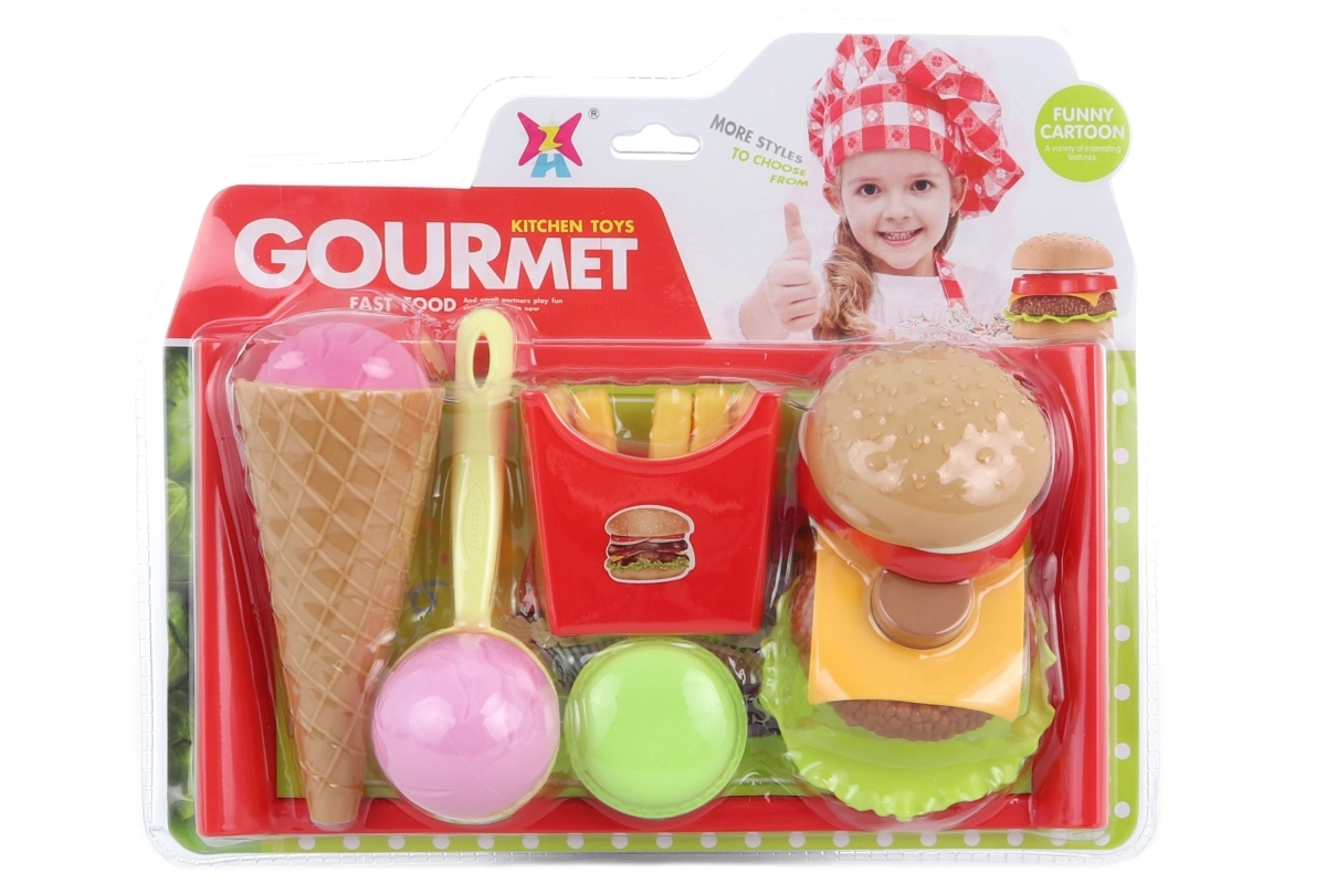 Zabavan dječji set plastične hrane s poslužavnikom za igru kuhinje ili restorana. Sadrži sladoled u kornetu, kuglicu sladoleda s žlicom za posluživanje, makaron, pomfrit i hamburger koji se može rastaviti na pojedine sastojke. Idealan za razvoj mašte, finu motoriku i zajedničku igru.