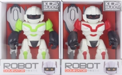 Plastični robot na baterije sa štitom i pištoljem. Robot hoda, okreće se, ispušta zvukove i svijetli. Napajanje na 3 AA baterije (nisu uključene). Dimenzije robota cca 16 x 21 cm. Dimenzije pakiranja cca 19,5 x 24 x 9,5 cm. Dob 3+