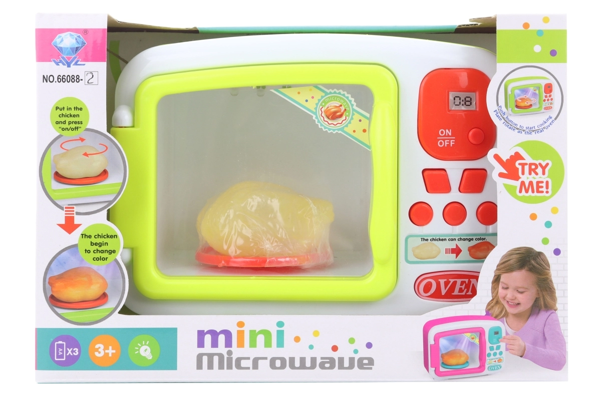 Zabavna dječja mikrovalna pećnica na baterije pruža realističan doživljaj igre. Ispušta realistične zvukove, tijekom „zagrijavanja“ svijetli i okreće se unutarnji tanjur. U paketu je plastična piletina koja mijenja boju – nakon „pečenja“ potamni, a nakon vađenja ponovno posvijetli. Savršena igračka za male kuhare od 3 godine naviše.