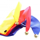 Šarena klaunska kapa u žutoj, crvenoj i plavoj boji s metalnim zvončićima za razigrani efekt pri svakom pokretu.