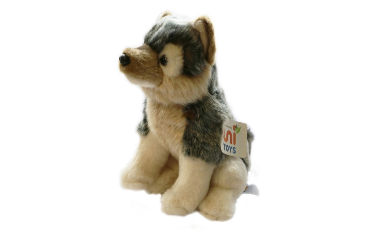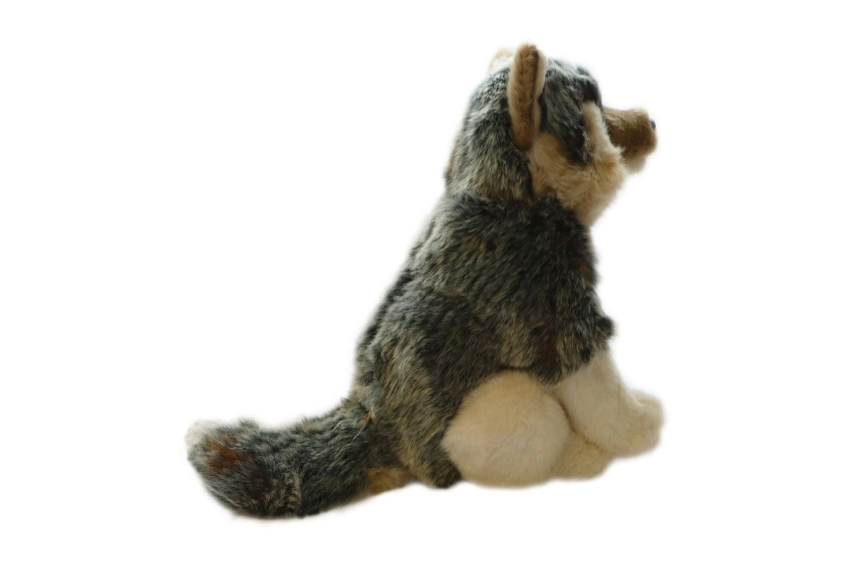 Plišani vuk koji sjedi, veličine približno 20 x 24 x 11 cm (bez repa). Duljina repa oko 9 cm. Dob 0+