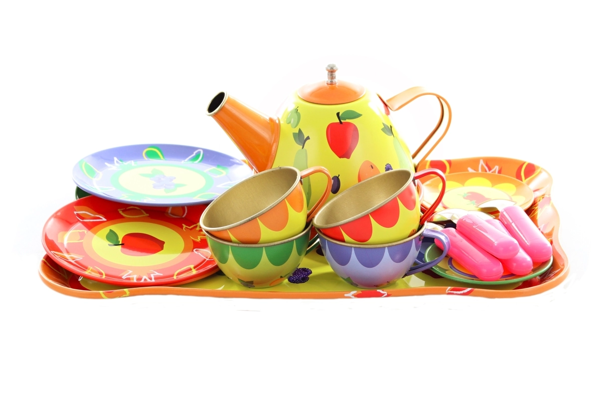 Dječji limeni čajni servis u živim bojama izvrstan je izbor za svaku malu domaćicu ili malog domaćina. Metalno izvedenje je lagano, a istodobno dovoljno izdržljivo za svakodnevnu igru. Zahvaljujući bogatoj opremi, djeca lako mogu prirediti vlastitu čajanku za prijatelje i plišane goste.