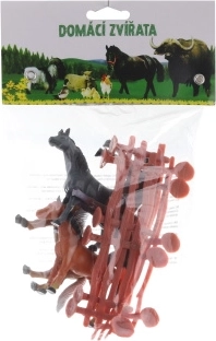 Plastične životinje – konji s ogradom. Pakiranje sadrži 4 konja i 4 dijela ograde. Dimenzije pakiranja približno 15 x 25 x 5 cm. Veličina životinja približno 10 cm (ovisno o vrsti). Dob 3+