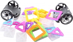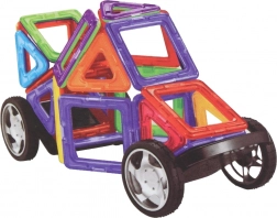 Set sadrži šarene magnetne oblike i kotače koji omogućuju stvaranje raznolikih konstrukcija, čime se jača prostorna mašta.