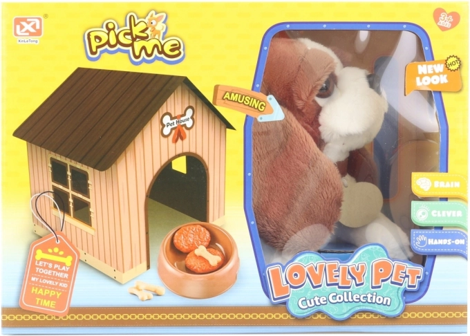 Plišani psić s kartonskom kućicom i dodacima za igru veterinara. Stetoskop, injekcija, zdjelica i ovratnik u pakiranju. Psić 19×12 cm. Dob 3+.