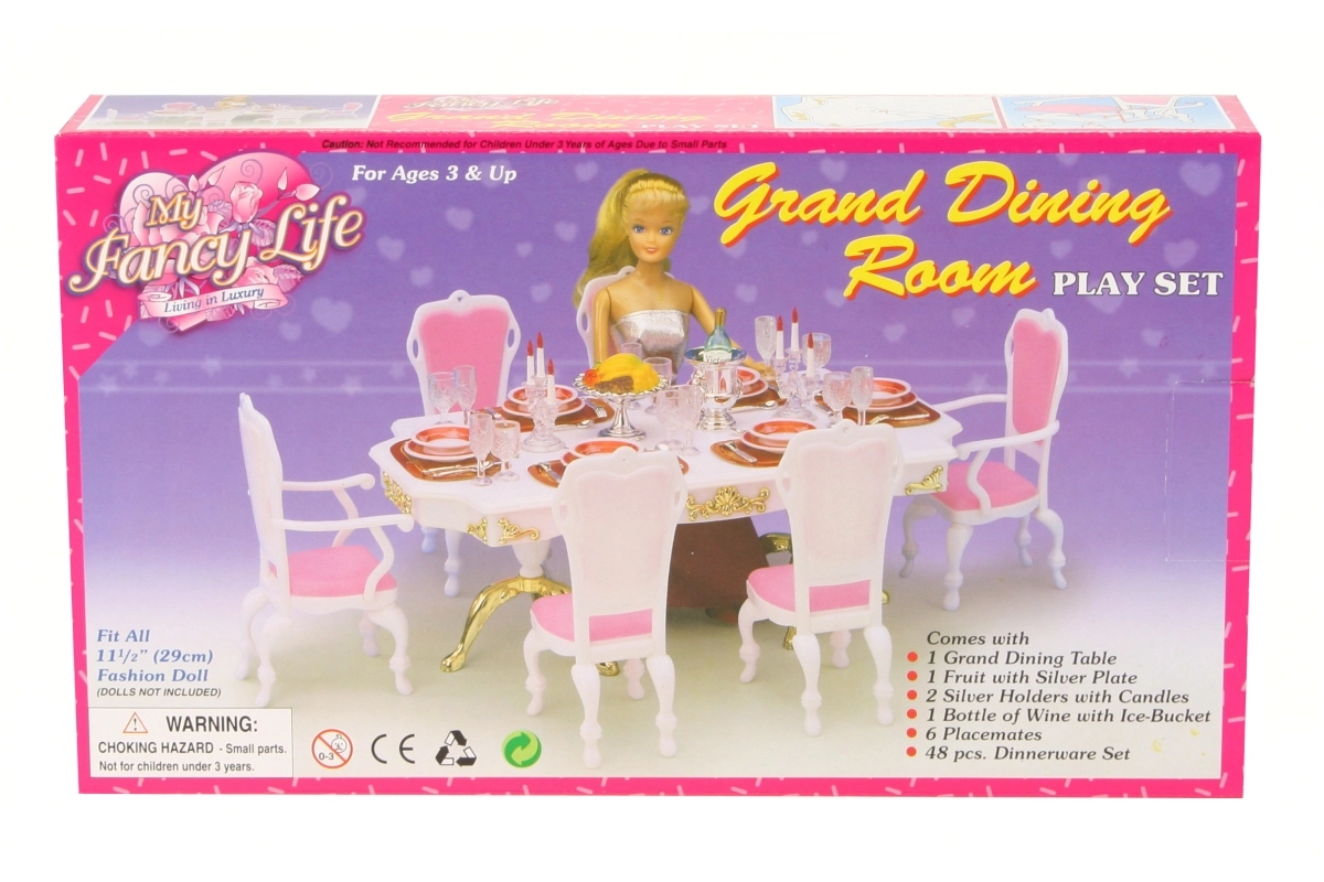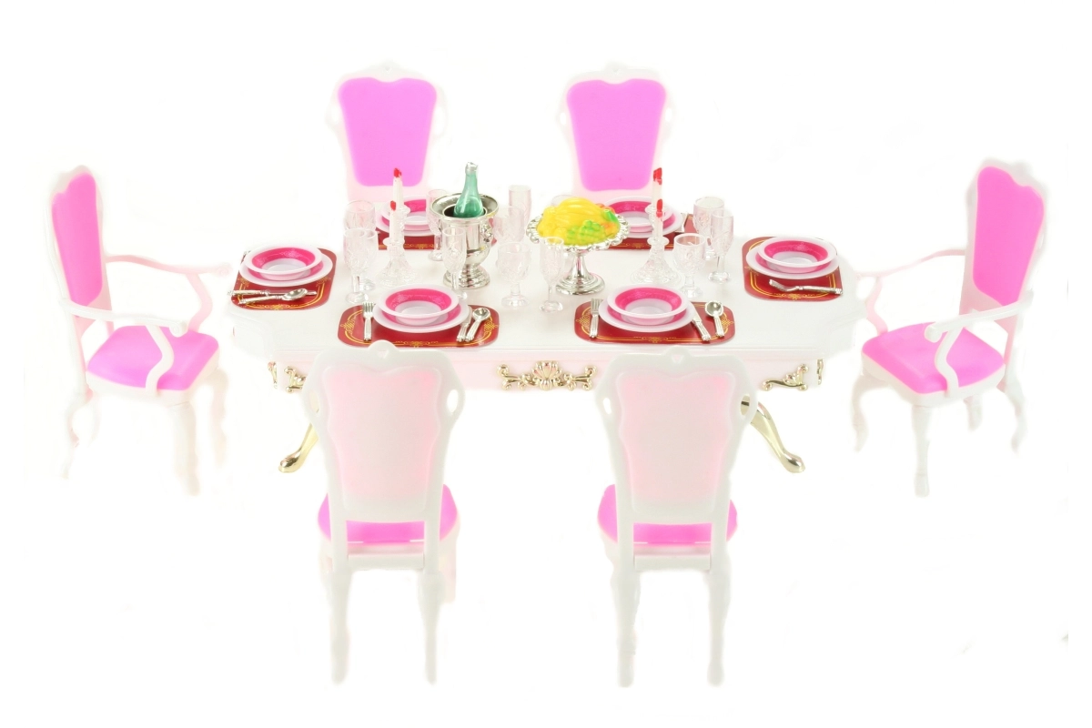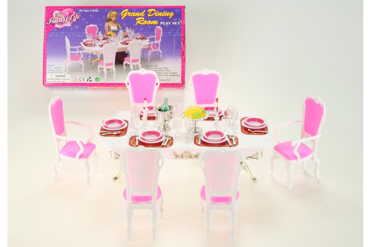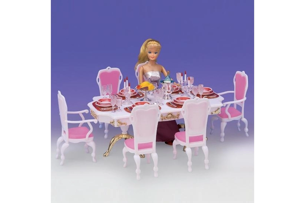 Stilski set Glorie za lutkarsko blagovanje pretvara svaku sobicu u elegantnu blagovaonicu. Sadrži veliki plastični stol, 6 stolica (2 s naslonima za ruke) i bogato postavljeno posuđe uključujući čaše, tanjure i pribor za jelo. Idealan za kreativnu igru djece od 3 godine.
