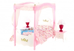Priuštite lutkama luksuzan san s elegantnim GLORIE krevetom s baldahinom. Set uključuje krevet s prekrivačem i jastučićem, dva noćna ormarića i dvije lampice koje se nakon zakretanja cilindra zasvijetle. Idealan za kreativnu igru i stilizirane kućice za lutke.