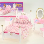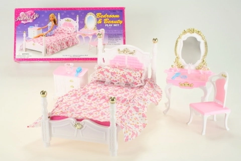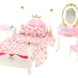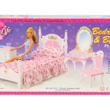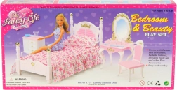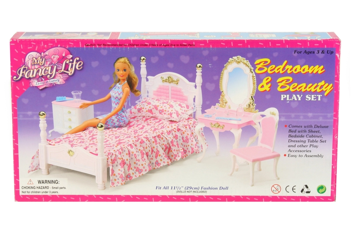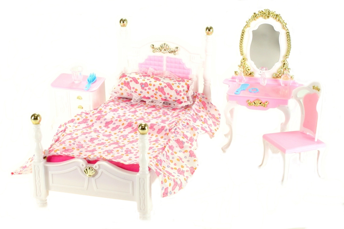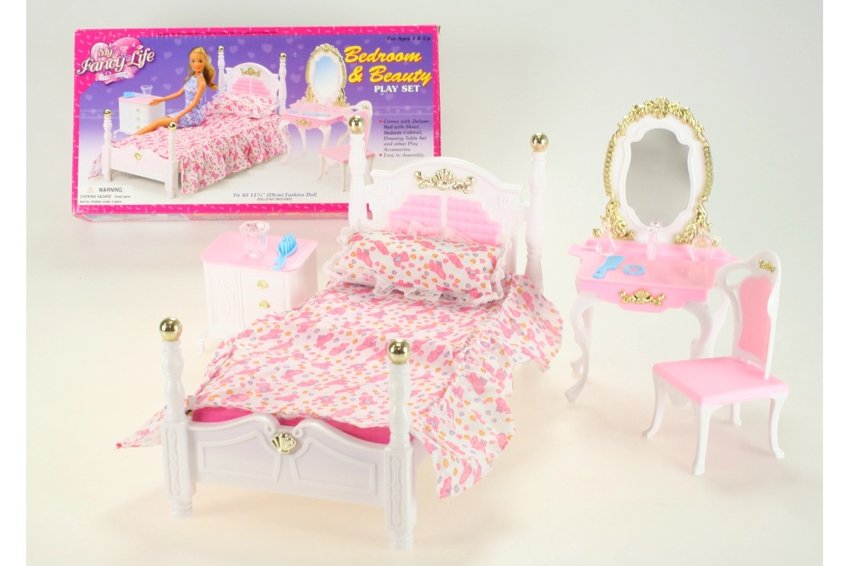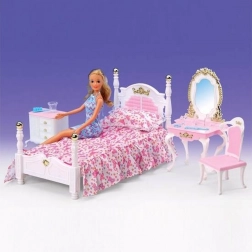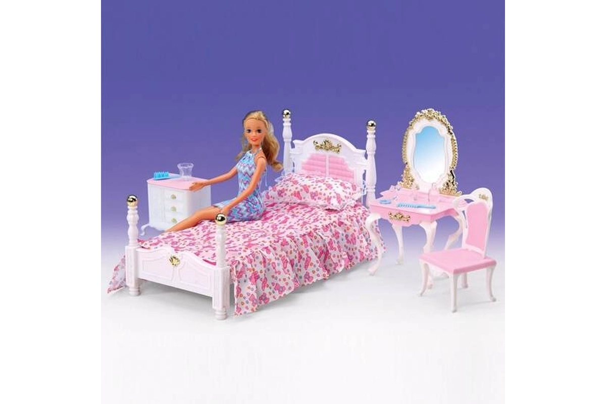Glorie Spavaća soba sadrži plastični krevet dimenzija cca 16 cm x 34 cm x 18 cm s prekrivačem i jastučićem, toaletni stolić dimenzija cca 13 cm x 8 cm x 22 cm s dodacima za lutke – češljić, narukvica, četka i bočice, fotelja cca 7 cm x 7 cm x 13 cm, noćni ormarić cca 8,5 cm x 6 cm x 8 cm. Lutka nije uključena u pakiranje. Dob: 3+