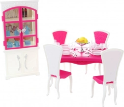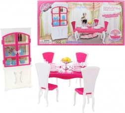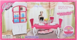 Glorie blagovaonski set za lutke nudi potpuni doživljaj blagovanja s elegantnim plastičnim stolom, četiri stolice i ormarićem, dopunjen s tanjurima, čašama, priborom za jelo i dekorativnim dodacima.