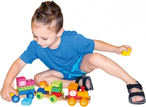 Multifunkcionalni drveni vlakić nije samo igračka na povlačenje, već i građevinski set koji omogućava djeci razvijanje kreativnosti. Dio vlakića su tri podvozja i 18 različitih kocaka koje se mogu slagati prema mašti.