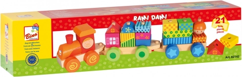 Drveni vlakić Bino je igračka na povlačenje i građevinski set. Izrađeno od izdržljivog drva, sadrži 18 kocaka za djecu od 3 godine.