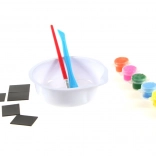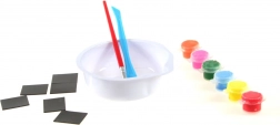 - Gips, plastična posudica, plastični kalup sa 6 motiva, 6 boja, kist, magneti, upute