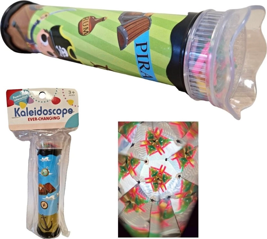 Dječji šareni kaleidoskop sa slikom pirata. Dimenzije kaleidoskopa cca 17 x 5 cm. Dimenzije pakiranja cca 10,5 x 24 x 5 cm. Dob 3+