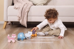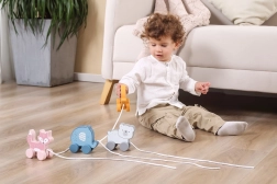Vučna igračka je lagana, jednostavna za držanje i sigurna – ima glatke rubove i kvalitetnu završnu obradu. Odlično se uklapa za igru kod kuće i u šetnji po stanu. Kompaktna veličina olakšava spremanje i prenošenje.