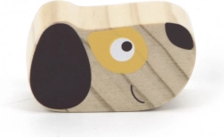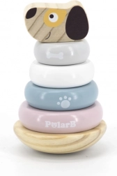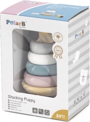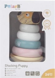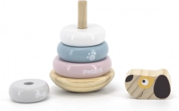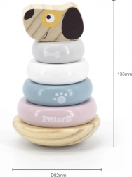Ova slagalica piramida s motivom psića donosi djeci radost otkrivanja i učenja. Glatki drveni dijelovi u nježnim pastelnim bojama lako se drže i malim ručicama, a slaganje prstenova na štapić potiče koncentraciju, strpljenje i prostornu maštu. Stabilna baza osigurava sigurnu igru, a simpatična pseća glava motivira na ponovno slaganje.
