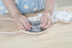 Glatki drveni dijelovi sa sigurnim otvorima i čvrstim uzicama. Idealno za svakodnevno vježbanje fine motorike.