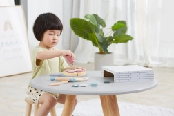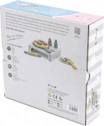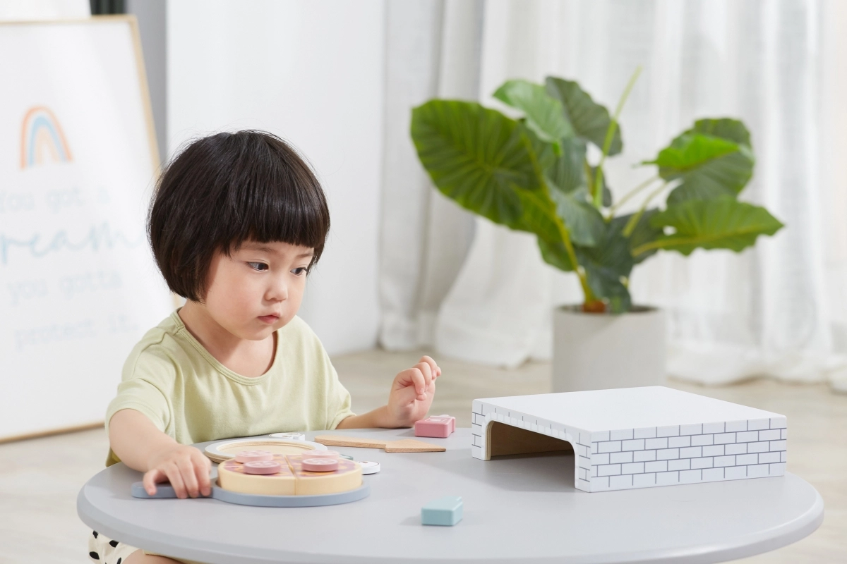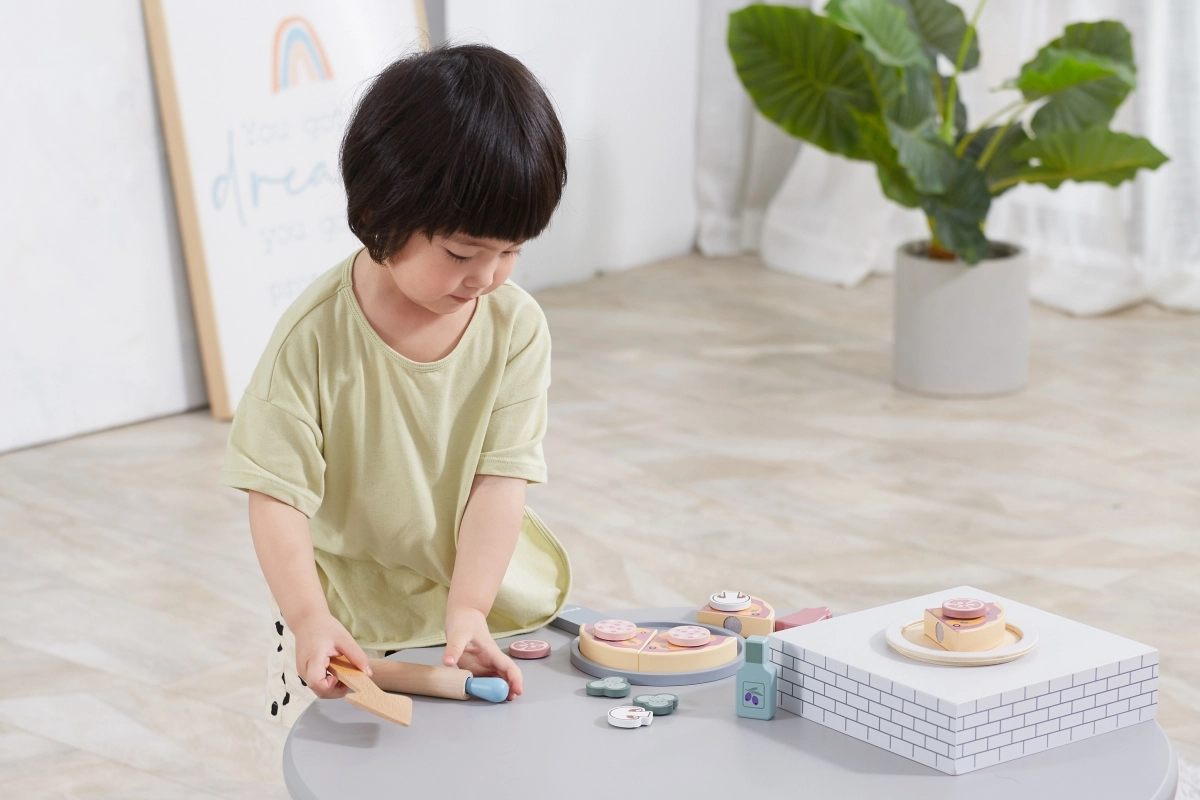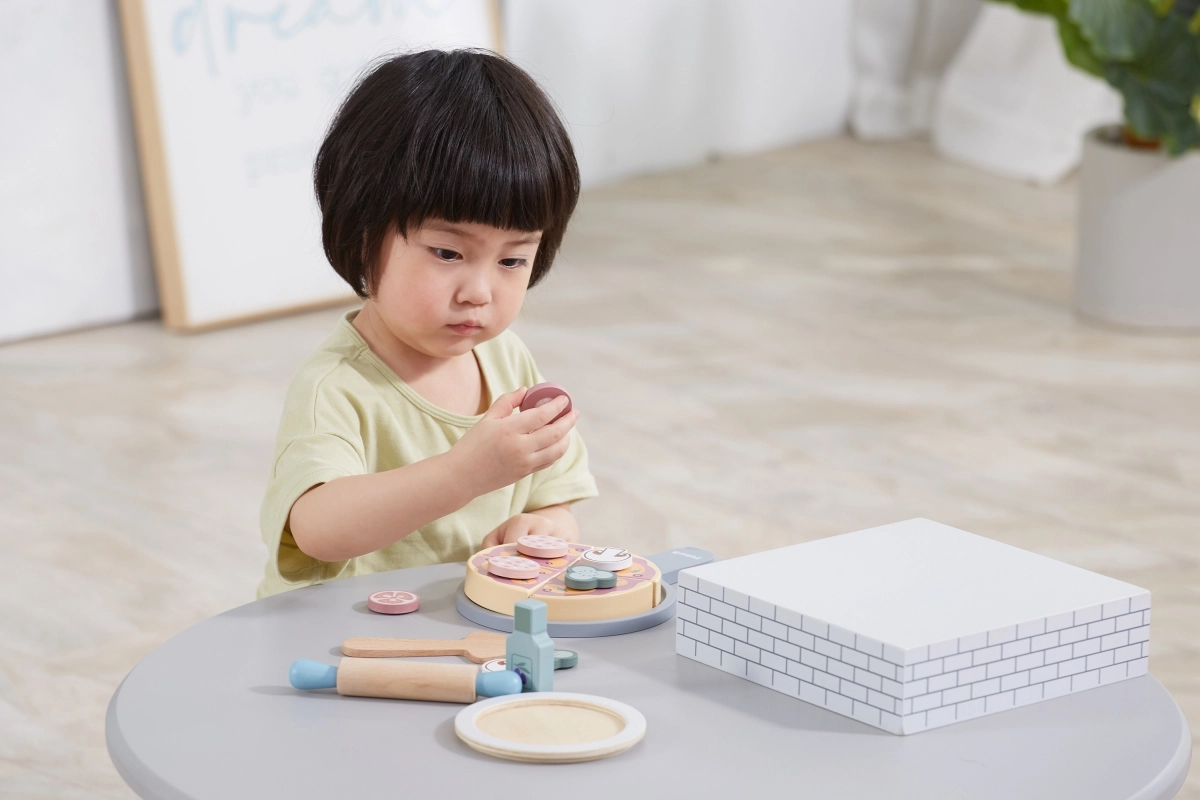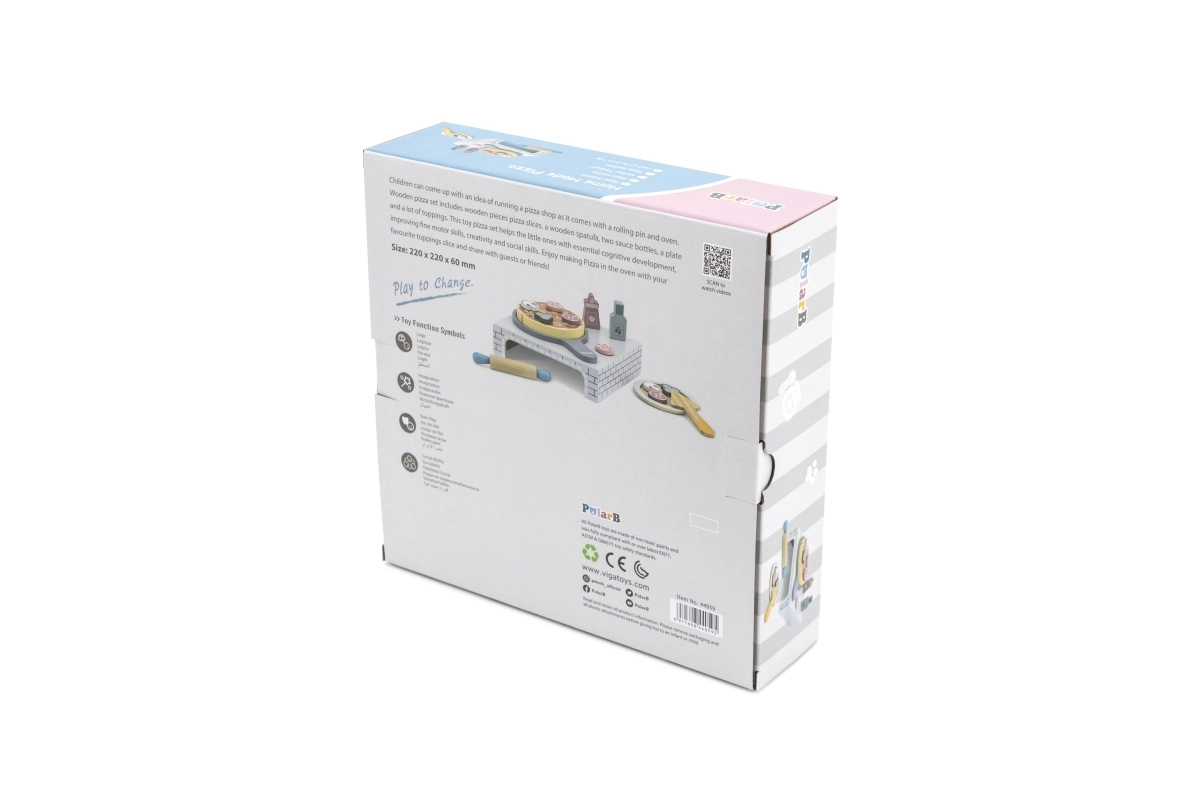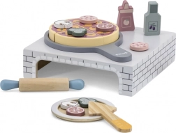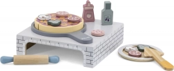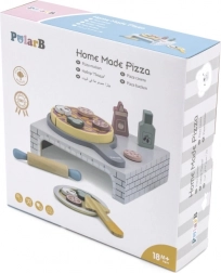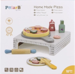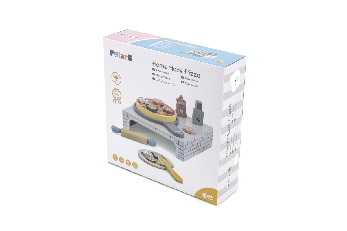 Ovaj drveni set za domaću pizzu pretvara dječju sobu u ugodnu pizzeriju. Djeca mogu valjati tijesto, slagati sastojke, peći u peći te potom poslužiti na tanjurić – sve kao u stvarnosti. Odvojivi dodaci i segmenti za rezanje potiču koordinaciju oko–ruka i razvoj mašte.