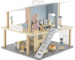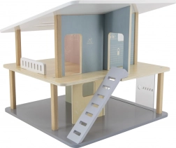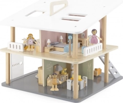 Stilna drvena kućica za lutke s dva kata, pet soba i terasom nudi otvoren pristup za lako igranje, prijenosno izvedenje s ručkom i sate kreativne, maštovite zabave za djecu od 3 godine.