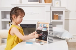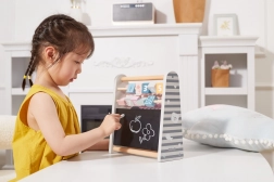 Sastavni dio je mala ploča i bezprašna kreda za pisanje brojki, prvih zadataka i vlastitih crteža – idealno za razvoj kreativnosti.
